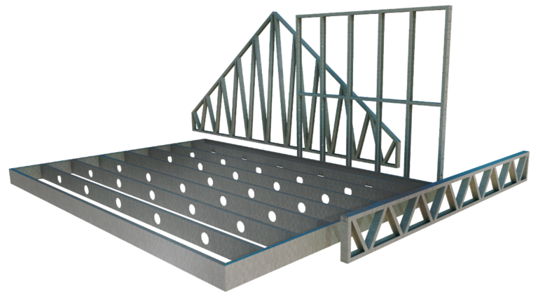 Nous pouvons concevoir et produire l’ensemble des éléments structurels d’un bâtiment (murs, toitures et planchers). Nous nous chargeons également de produire les plans d’exécutions, plans de montage et notes de calculs.